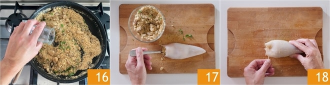 Gießen Sie das Wasser hinzu 16 und mischen Sie. Auf diese Weise bleibt die Füllung weicher und feuchter. Nehmen Sie die Calamaribeutel wieder und füllen Sie sie mit der Mischung 17, dann verschließen Sie die Enden mit Zahnstochern 18.