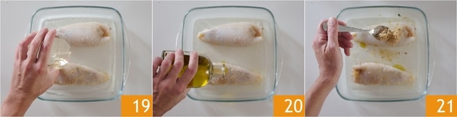 Legen Sie die Calamari in eine Auflaufform, dann gießen Sie den Weißwein 19 und einen Schuss Öl 20 hinzu. Fügen Sie etwas von der restlichen Füllung obendrauf hinzu 21.