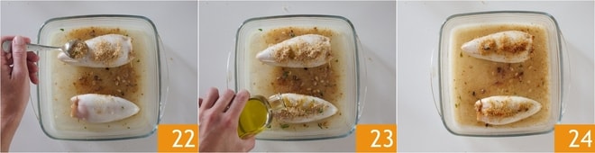 Backen Sie die gefüllten Calamari in einem vorgeheizten Umluftofen bei 190° für 7-8 Minuten. Nehmen Sie die Pfanne aus dem Ofen, drehen Sie sie um und fügen Sie die eventuell noch verbliebene Füllung hinzu 22. Beträufeln Sie sie mit einem Schuss Öl und setzen Sie das Backen für weitere 7-8 Minuten fort. Nehmen Sie sie aus dem Ofen 24 und servieren Sie die im Ofen gefüllten Calamari mit der Kochsauce 24.