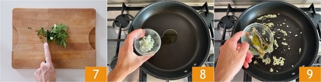 Hacken Sie auch ein Bündel Petersilie 7 und legen Sie es beiseite. Geben Sie einen Schuss Öl in eine Pfanne, fügen Sie die gehackte Zwiebel hinzu 8 und lassen Sie sie weich werden. Fügen Sie die Sardellen hinzu 9 und lassen Sie sie durch die Hitze schmelzen.