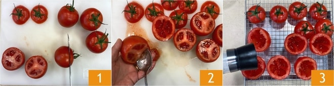 Um die gefüllten Tomaten nach Großmutters Art zuzubereiten, schneiden Sie zuerst die Deckel der Tomaten ab 1 und legen Sie sie beiseite, dann entleeren Sie das Fruchtfleisch mit einem Löffel und bewahren Sie es ebenfalls auf 2. Salzen Sie das Innere der Tomaten leicht 3.