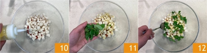 Füge einen Schuss Öl hinzu 10 und einige zerrissene Blätter Basilikum 11, rühre um 12 und lasse es 30 Minuten bei Raumtemperatur ziehen.
