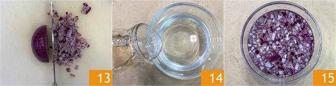 In der Zwischenzeit die Zwiebel schälen und hacken 13. Wasser und Essig in eine Schüssel geben 14, die gehackte Zwiebel eintauchen und 10 Minuten einweichen lassen 15.