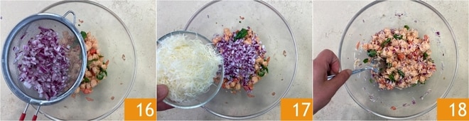 Nach dieser Zeit die Zwiebel abtropfen lassen und der Brotmasse hinzufügen 16. Fügen Sie auch eine Prise Salz und den geriebenen Pecorino hinzu, wobei etwas für die Oberfläche aufbewahrt wird 17. Umrühren, um alles zu vermischen 18.