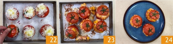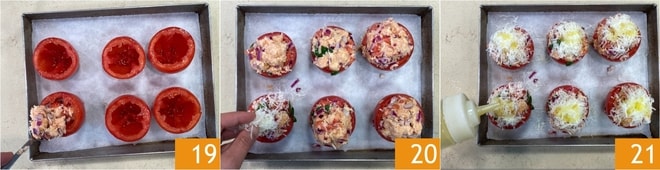 Nehmen Sie die ausgehöhlten Tomaten und legen Sie sie in ein mit Backpapier ausgelegtes Blech, füllen Sie sie dann mit der Füllung, bis eine Kuppel entsteht 19. Die Oberfläche mit dem zurückgehaltenen Pecorino garnieren 20 und einen Schuss Öl darüber geben 21.