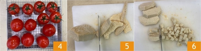 Stellen Sie die Tomaten auf ein Gitter 4 und lassen Sie sie ruhen, damit sie die überschüssige Flüssigkeit verlieren. In der Zwischenzeit machen Sie mit dem Rest des Rezepts weiter: Entfernen Sie die Kruste des Brotes 5 und schneiden Sie die Krume in Würfel 6.