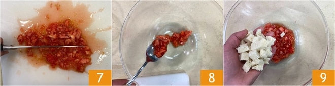 Hacke das Tomatenfleisch grob 7 und gib es in eine Schüssel 8, füge dann die Brotkrume hinzu 9.