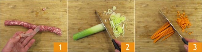 Um die gefüllten Wirsingrouladen zuzubereiten, schneiden Sie die Wurst ein und entfernen Sie die Pelle 1, dann zerbröseln Sie sie und legen sie beiseite, säubern Sie den Lauch und schneiden Sie ihn in Scheiben 2, dann säubern Sie auch die Karotte und würfeln Sie sie 3.