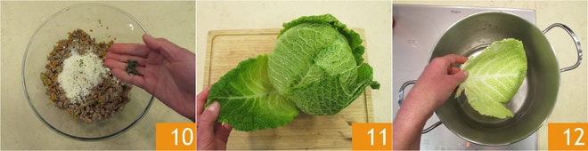 Mit gezupftem Thymian aromatisieren 10. Vermengen und abkühlen lassen. In der Zwischenzeit 8 große Blätter vom Wirsing abtrennen 11, darauf achten, die weniger dunklen zu verwenden, dann waschen und in gesalzenem Wasser für 5 Minuten blanchieren 12.