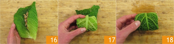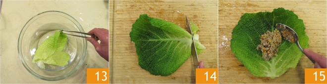 Abgießen und in eine Schüssel mit kaltem Wasser tauchen, um den Garprozess zu stoppen. Dann abtrocknen. Den harten Teil des Blattes entfernen 14. Die Wirsingblätter in der Mitte mit 2-3 großzügigen Löffeln Füllung füllen 15.