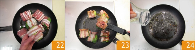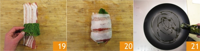 Jede Roulade mit 2 leicht überlappenden Speckscheiben umwickeln 19 20, so dass das Päckchen fast vollständig bedeckt ist. Einen Schuss Öl in der Pfanne erhitzen 21.