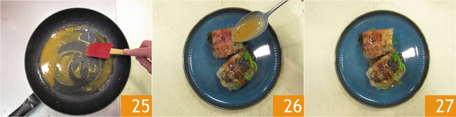 Vermischen, um die Fette zu emulgieren 25 und eine dicke Soße zu erhalten. Die gefüllten Wirsingrouladen mit dem Bratfonds servieren 26 und heiß genießen 27.