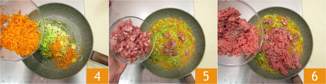 In einer Pfanne mit einem Schuss Öl den Lauch und die Karotte auf niedriger Flamme weich dünsten 5 für ein paar Minuten, dann die Wurst und das Hackfleisch hinzufügen 6.