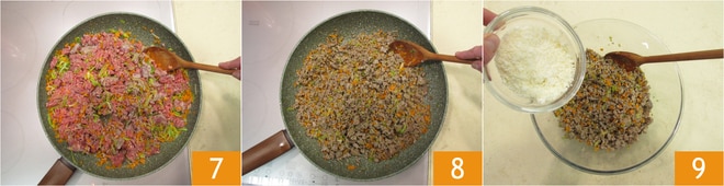 Vermengen 7 und für 10 Minuten kochen lassen. Sobald das Ragù fertig ist 8, in eine Schüssel geben und den geriebenen Käse 9, Salz und Pfeffer hinzufügen.