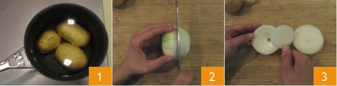 Um die gefüllten Zwiebeln mit Trüffel vorzubereiten, kochen Sie zuerst die Kartoffeln in reichlich kaltem Wasser 1, bringen Sie sie zum Kochen und lassen Sie sie kochen, bis Sie sie leicht mit einer Gabel einstechen können: Die Kochzeit variiert je nach Größe der Kartoffeln und beträgt etwa 30-40 Minuten. In der Zwischenzeit schälen Sie die Zwiebeln, halbieren Sie sie quer 2 und entfernen Sie die inneren Schichten 3.