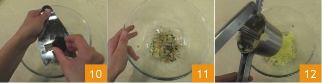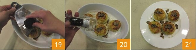und fügen Sie 4 g schwarzen Trüffel hinzu, indem Sie den speziellen Trüffelschneider verwenden (10-11), dann drücken Sie die noch heißen Kartoffeln direkt in die Schüssel 12.