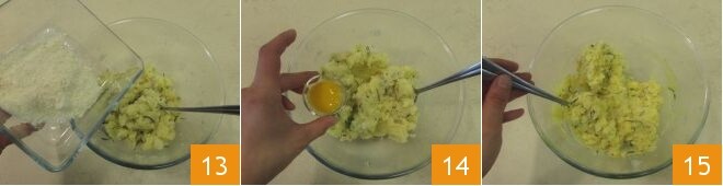 Fügen Sie auch den geriebenen Parmesan 13, das Eigelb 14, Salz und Pfeffer hinzu und vermischen Sie alles gut 15. Geben Sie die erhaltene Mischung in einen Spritzbeutel ohne Tülle.