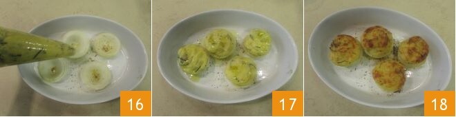 Entfernen Sie die Zwiebeln aus dem Ofen und füllen Sie sie mit der Kartoffel-Trüffel-Mischung 16, dann geben Sie etwas Öl darüber 17 und backen Sie sie weitere 15 Minuten bei 220°, dann schalten Sie den Grill ein und setzen Sie das Backen für weitere 5 Minuten fort 18.