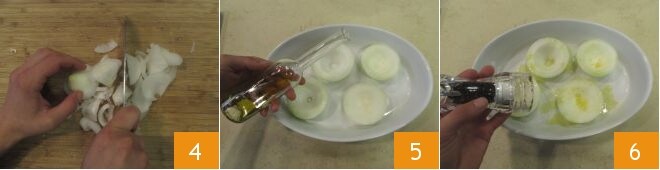 Hacke das Innere der Zwiebeln 4 und lege es vorübergehend beiseite. Die ausgehöhlten Zwiebeln in eine Auflaufform geben, mit Öl 5, Salz und Pfeffer würzen 6 und im vorgeheizten, statischen Ofen bei 220° für 20 Minuten backen.