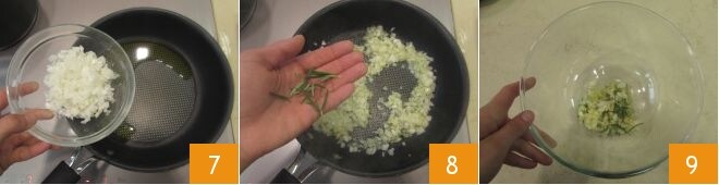 Während die Zwiebeln kochen, bereiten Sie die Füllung vor: Erhitzen Sie etwas Öl in einer Pfanne, fügen Sie die gehackte Zwiebel hinzu 7 und braten Sie sie ein paar Minuten lang an, dann fügen Sie den Rosmarin hinzu 8. Geben Sie das Zwiebelsoffritto in eine große Schüssel 9