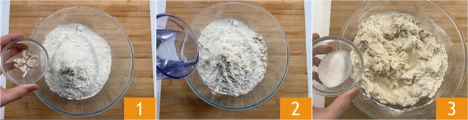 Um den gefüllten Calzone zuzubereiten, beginnen Sie mit dem Teig: Geben Sie das Mehl, die zerbröckelte frische Hefe 1 und fast das ganze angegebene Wasser 2 in eine Schüssel. Beginnen Sie mit einem Löffel zu rühren und fügen Sie auch das Salz hinzu 3.