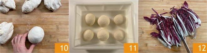 Teilen Sie ihn in 6 gleich schwere Teigbälle 10 (ca. 270 g jeweils). Legen Sie sie in eine Gärbox 11, decken Sie sie mit einem Deckel ab und lassen Sie sie 2 Stunden bei Raumtemperatur gehen. In der Zwischenzeit kümmern Sie sich um die Füllung: Schneiden Sie den Radicchio in Streifen 12.