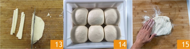 Schneiden Sie den Fiordilatte in Stifte 13 und lassen Sie ihn in einem Sieb abtropfen. Nehmen Sie die gegangenen Teigbälle 14, rollen Sie sie mit etwas Mehl auf der Arbeitsfläche aus 15.