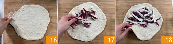 Sie können sie von Hand 16 oder mit einem Nudelholz ausrollen, um Disks von etwa 30 cm Durchmesser zu erhalten. Füllen Sie mit Gorgonzola, Radicchio 17 und Fiordilatte 18.