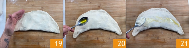 Falten Sie den Teig zur Hälfte 19 und verschließen Sie den Rand sorgfältig. Bestreuen Sie die Oberfläche mit Öl 20 und Parmigiano Reggiano DOP 21.