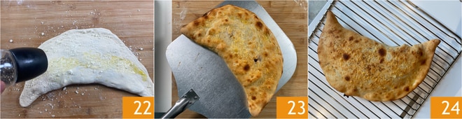 Schließlich würzen Sie nach Belieben mit schwarzem Pfeffer 22. Erhitzen Sie den Pizzastein 30 Minuten lang. Backen Sie im vorgeheizten statischen Ofen bei 250°C, dann schieben Sie den Calzone in den Ofen und backen Sie 15 Minuten 23. Nehmen Sie den Calzone heraus und servieren Sie ihn heiß 24.