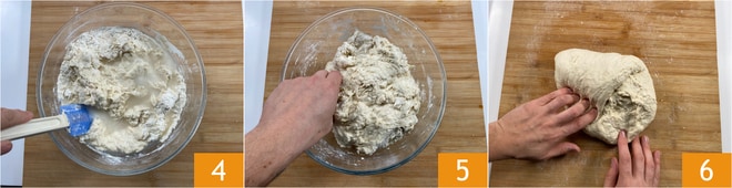 Rühren Sie weiter und fügen Sie je nach Bedarf Wasser hinzu 4. Sobald die Zutaten zusammengekommen sind, beginnen Sie von Hand zu kneten 5, formen Sie einen Teigball und wechseln Sie zur Arbeitsfläche 6.