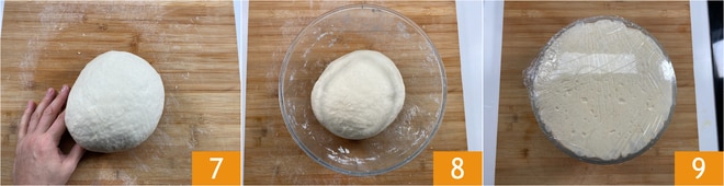 Kneten Sie weiter, bis Sie einen glatten Teigball erhalten 7, legen Sie ihn in eine Schüssel 8, decken Sie ihn mit Frischhaltefolie ab und lassen Sie ihn eine Stunde bei Raumtemperatur gehen, bevor Sie ihn für 12 Stunden in den Kühlschrank stellen. Nehmen Sie den gegangenen Teig heraus 9.