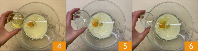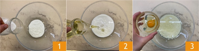 Um den gefüllten Kokoskuchen zuzubereiten, geben Sie zunächst den Kokosjoghurt, die Milch 1, das Pflanzenöl 2 und das Ei 3 in eine Schüssel.