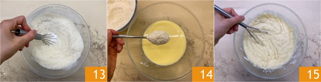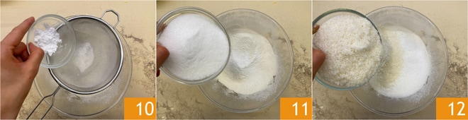 Sieben Sie auch das Natron 10, dann fügen Sie den Zucker 11 und die geraspelten Kokosnüsse 12 hinzu.