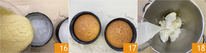 Fetten Sie zwei Springformen mit einem Durchmesser von 20 cm ein, legen Sie einen Boden mit Backpapier aus und mehlen Sie die Ränder. Teilen Sie den Teig gleichmäßig auf die Formen auf 16. Stellen Sie beide Formen auf die untere Schiene des vorgeheizten Backofens und backen Sie sie im statischen Modus bei 175°C 35 Minuten lang 17. In den letzten Minuten überprüfen Sie die Garzeit mit der Stäbchenprobe. Da dieses Rezept keine Tränke vorsieht, ist es wichtig, dass die Kuchen nicht zu lange gebacken werden, um einen ausreichend feuchten Teig zu erhalten. Sobald sie fertig sind, aus dem Ofen nehmen und vollständig abkühlen lassen. In der Zwischenzeit das Frosting zubereiten: Geben Sie Mascarpone und Frischkäse in eine Küchenmaschine und fügen Sie die frische Sahne hinzu 18.