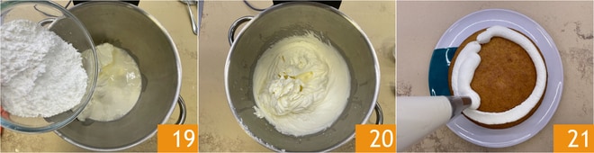 Fügen Sie den Puderzucker hinzu 19 und schlagen Sie mit dem Schneebesen, bis eine ziemlich feste Creme entsteht 20. Sie können dasselbe Verfahren auch mit einer Schüssel und einem Handmixer durchführen. Füllen Sie die Creme in einen Spritzbeutel mit einer glatten Tülle von 10-12 mm Durchmesser. Wenn die Kuchen abgekühlt sind, nehmen Sie sie aus der Form und schneiden Sie, wenn nötig, die Kuppel ab, um sie problemlos auf eine Servierplatte legen zu können. Verteilen Sie auf der Oberfläche eine etwa 1,5-2 cm dicke Schicht Creme 21.