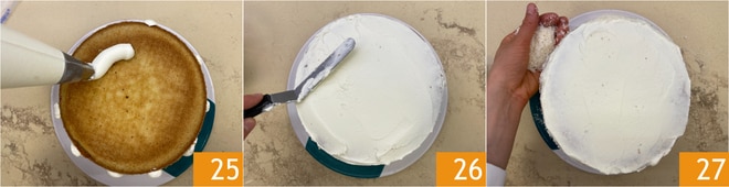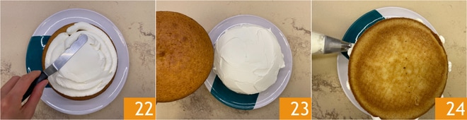 Glätten Sie die Creme 22, dann legen Sie den zweiten Kuchen mit der Kuppel nach unten darauf 23. Verteilen Sie das Frosting an den Rändern in vertikalen Streifen 24.