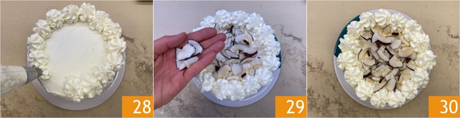 Drücken Sie mit einer gezackten Tülle Sahnehäubchen entlang des Randes der Oberfläche 28. Zum Schluss dekorieren Sie die Mitte mit getrockneten Kokosflocken 29. Lassen Sie den Kuchen vor dem Servieren mindestens 2-3 Stunden im Kühlschrank ruhen. Ihr gefüllter Kokoskuchen ist bereit zum Genießen 30!