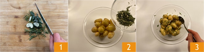 Um das gefüllte Perlhuhn zuzubereiten, bereiten Sie zunächst eine Mischung aus Rosmarin, Salbei und den geschälten Knoblauchzehen vor 1. Waschen Sie die neuen Kartoffeln, trocknen Sie sie ab und halbieren Sie sie, wenn sie zu groß sind, ohne sie zu schälen. Geben Sie sie in eine Schüssel, würzen Sie sie mit Salz, Öl und der Hälfte der aromatischen Mischung 2. Gut mischen 3.