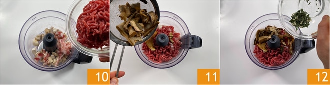 Geben Sie nun die Champignons, den Speck, das Hackfleisch 10, die inzwischen rehydrierten und abgetropften Steinpilze 11 und fast die gesamte restliche aromatische Mischung 12 in einen Mixer mit Messern. Fügen Sie auch eine Prise Salz hinzu, aber übertreiben Sie es nicht.