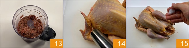 Pürieren Sie gut, bis eine homogene Masse entsteht 13. Nehmen Sie das Perlhuhn und stellen Sie sicher, dass keine Federn vorhanden sind, ansonsten verbrennen Sie sie mit einem Bunsenbrenner 14 oder halten Sie das Perlhuhn über den Herd. Salzen Sie dann sowohl das Innere als auch die Haut des Perlhuhns 15 und massieren Sie es gut, damit das Salz auch ins Innere eindringt.