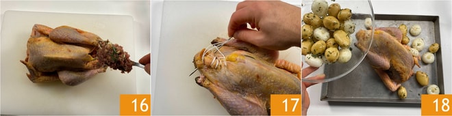 Füllen Sie es mit der gerade zubereiteten Füllung 16 und verschließen Sie den unteren Teil mit Nadel und Küchengarn 17, damit die Füllung beim Kochen nicht herauskommt. Legen Sie das Perlhuhn in eine Backform und verteilen Sie die Beilage aus kleinen Zwiebeln und Kartoffeln darum 18.