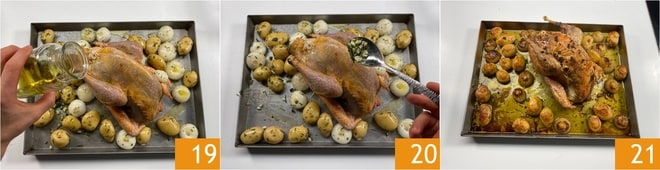 Würzen Sie das Perlhuhn mit einem Schuss Öl 19 und fügen Sie die restliche Mischung hinzu 20. Backen Sie es bei 200 °C für 20 Minuten, dann befeuchten Sie das Perlhuhn mit der Brühe und garen Sie es weitere 70 Minuten bei 180 °C. Holen Sie das gefüllte Perlhuhn aus dem Ofen 21 und lassen Sie es einige Minuten ruhen, bevor Sie es servieren.