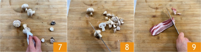 In der Zwischenzeit reinigen Sie die Champignons mit einem feuchten Tuch und entfernen Sie die Basis mit einem Messer 7. Schneiden Sie sie dann in Stücke 8. Schneiden Sie auch den Speck in Würfel 9.