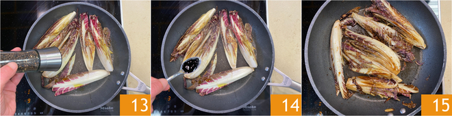 Wenn er eine Kruste bildet, fügen Sie Salz, Pfeffer 13 und Balsamicoessig hinzu 14; kochen Sie den Radicchio insgesamt etwa 5 Minuten. Sobald er gekocht ist, stellen Sie den Radicchio beiseite 15.