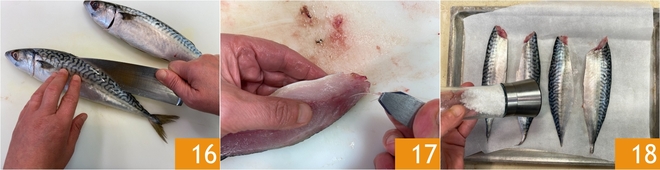 Nun reinigen Sie die Makrele: Schneiden Sie die Filets heraus 16 und entfernen Sie die Gräten 17, dann salzen Sie sie von beiden Seiten 18.
