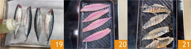 Würzen Sie auch mit einem Spritzer Öl 19. Erhitzen Sie den Grill gut und legen Sie die Makrelenfilets mit der Hautseite nach unten darauf. Grillen Sie sie 4-5 Minuten pro Seite 20, oder bis das Fleisch undurchsichtig wird und sich leicht zerteilen lässt 21.