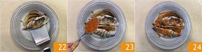 Richten Sie 2 Makrelenfilets pro Person an, abwechselnd mit den Radicchio-Spalten 22, dann beträufeln Sie alles mit der Sauce 23. Ihre gegrillte Makrele mit Zitrussauce ist servierfertig 24!