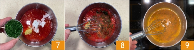 Würzen Sie mit Salz, Pfeffer und gehackter Petersilie 7 und mischen Sie alles gut 8. Stellen Sie den Topf auf den Herd und lassen Sie die Sauce unter ständigem Rühren etwa zehn Minuten lang eindicken 9.