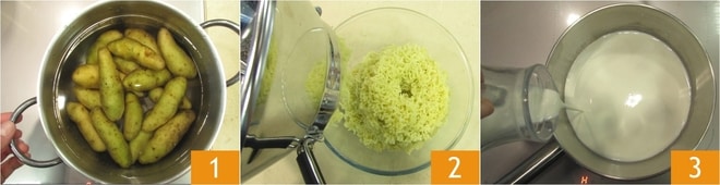 Um die Kartoffelcreme zuzubereiten, kochen Sie zunächst die Kartoffeln: Legen Sie sie in einen Topf mit kaltem Wasser, bringen Sie es zum Kochen und kochen Sie sie je nach Größe etwa 30 Minuten lang 1. Sobald sie gekocht sind, schälen Sie sie und drücken Sie sie sofort durch eine Kartoffelpresse, während sie noch heiß sind 2. In der Zwischenzeit Milch und Sahne in einem kleinen Topf 3 erhitzen und fast zum Kochen bringen.